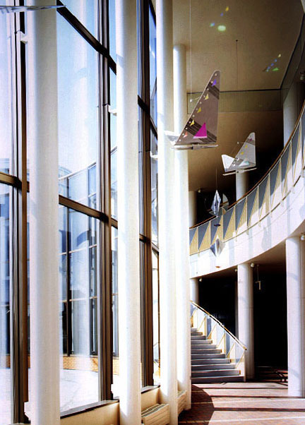 金属とガラスという素材をもちいて内空間へ光と色彩を取り込むと同時にプラザ側からの